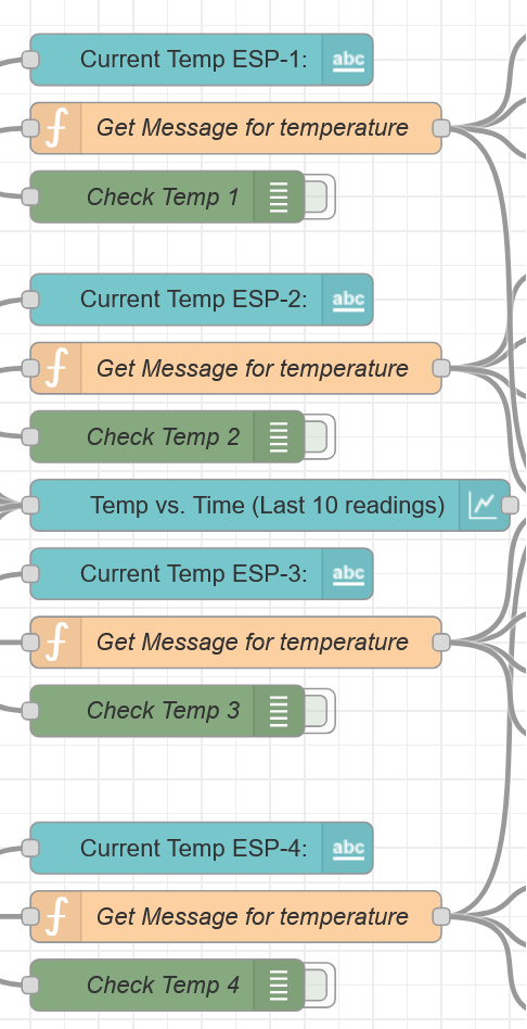 The values are published onto the dashboard using a text node (Current Temp ESP-#), while temperature values are checked using function nodes (Get Message for Temperature). [Publishing/Manipulating Flow]