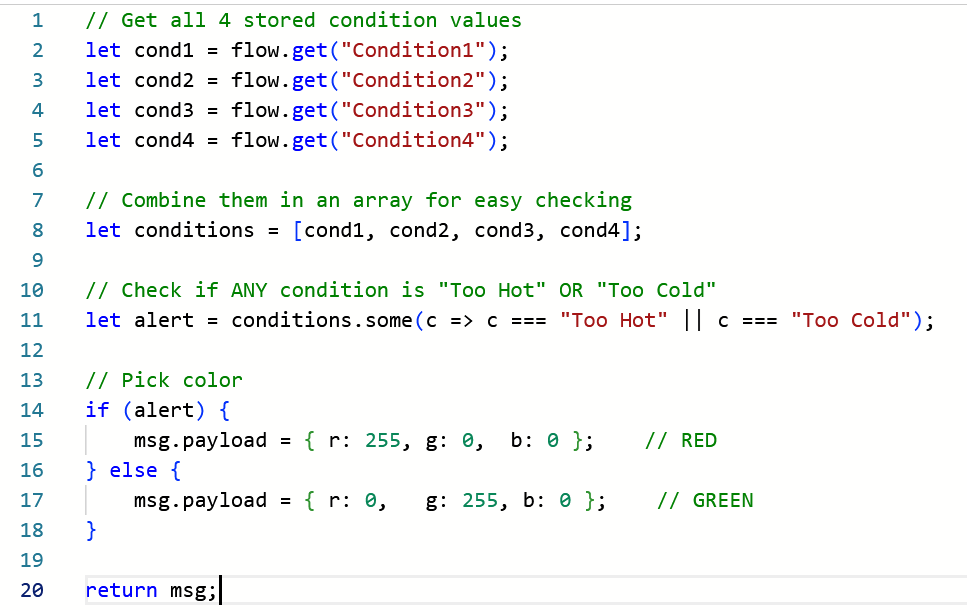 Finally the function Node (function1) collects the current condition from each node and outputs LED Values. ([Code]) If the temperature is too hot or too cold the function sends out a JSON message to the gateway (LEDOverride4482) to change the LED values of the nodes to RED. Otherwise it sends the gateway a value of GREEN.