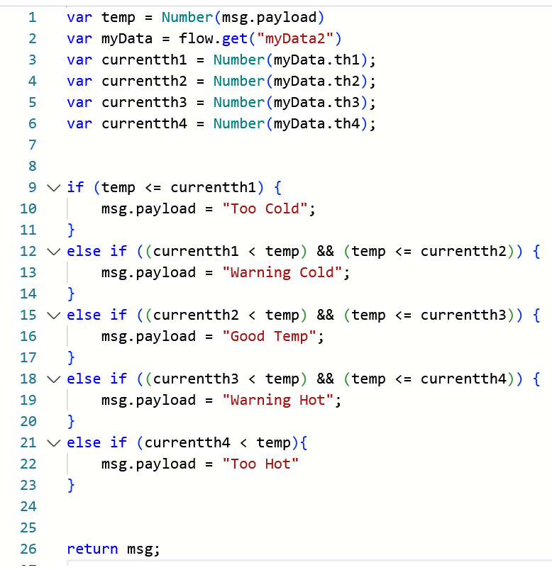 Node-red does most of the processing in terms of determining the temperature status and reporting back to the gateway.
